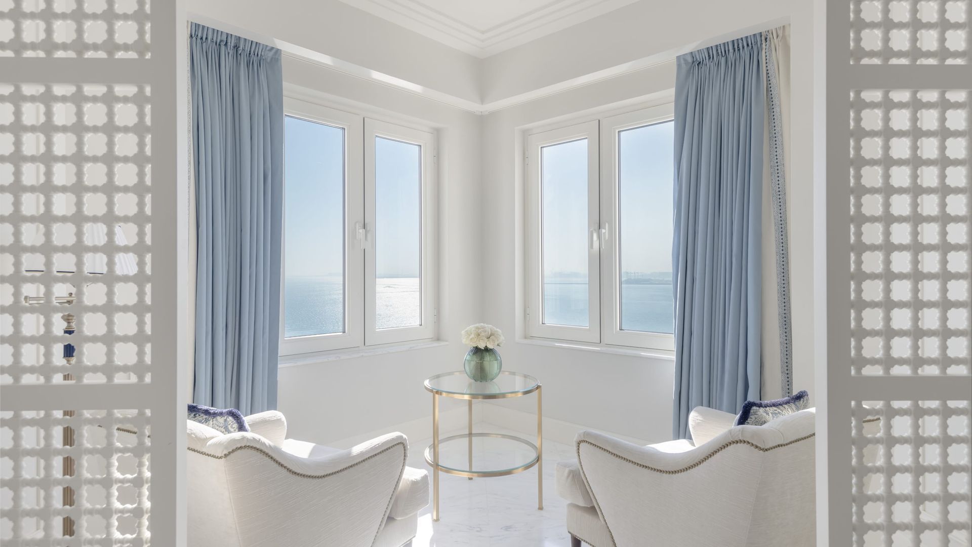 Befitting heads of state and VIPs, this magnificent two-bedroom suite wraps around two sides of the tower at Four Seasons Doha for truly panoramic views. Entertain in the majiles-style living room, including a grand piano and a dining table for ten.